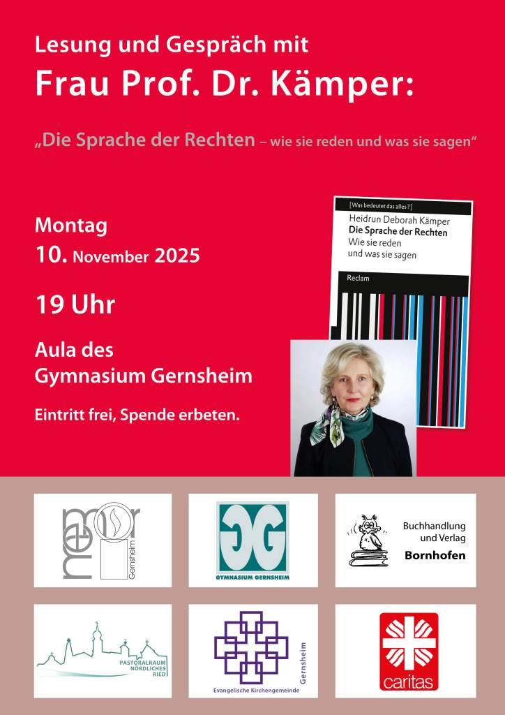 Die Kooperationsveranstaltung mit Caritas Netzwerk, evangelischer Kirchengemeinde Gernsheim, katholischem Pastoralraum, Buchhandlung Bornhofen und Gymnasium Gernsheim wird von Gernsheims Stadtverordnetenvorsteher Herr Josef Geiger unterstützt und richtet sich an alle Menschen, die sich Sorgen um unsere Demokratie machen und den Kampf gegen den Rechtsextremismus unterstützen. Der Eintritt ist frei.